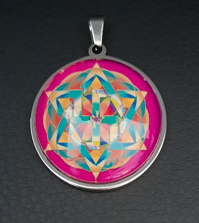 • Pendant composed of a piece of Glass round crimped on a Inox plated Metal mounting.